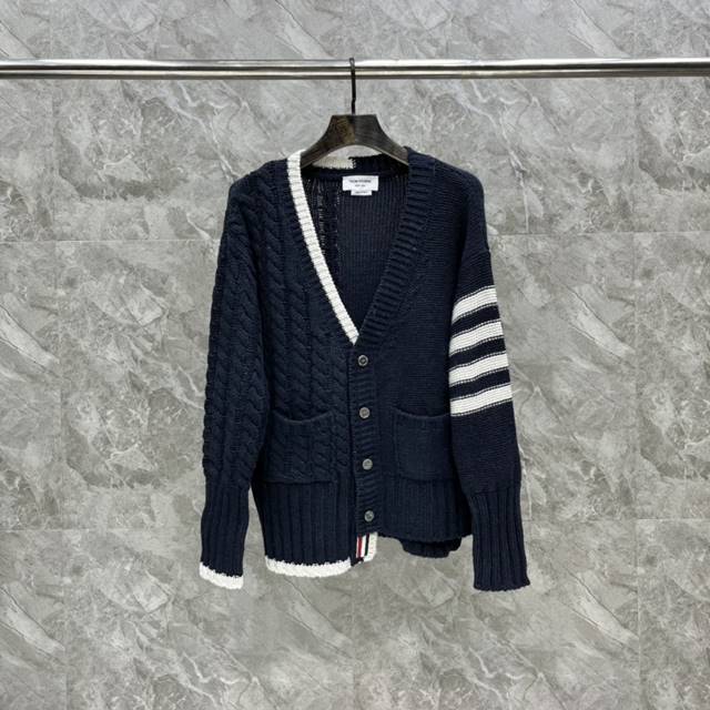 • 톰브라운 사선 브이넥 남여공용 가디건 4칼라