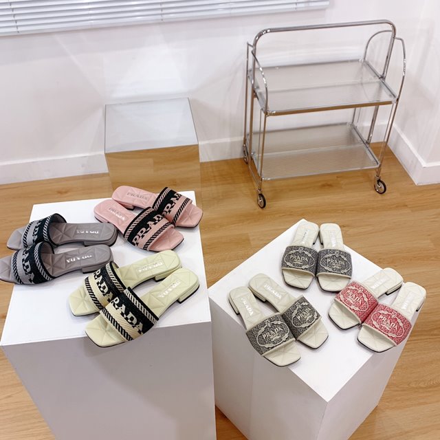 프라다 자수 장식 패브릭 슬라이드 슬리퍼 1XX612 > 여성-슈즈