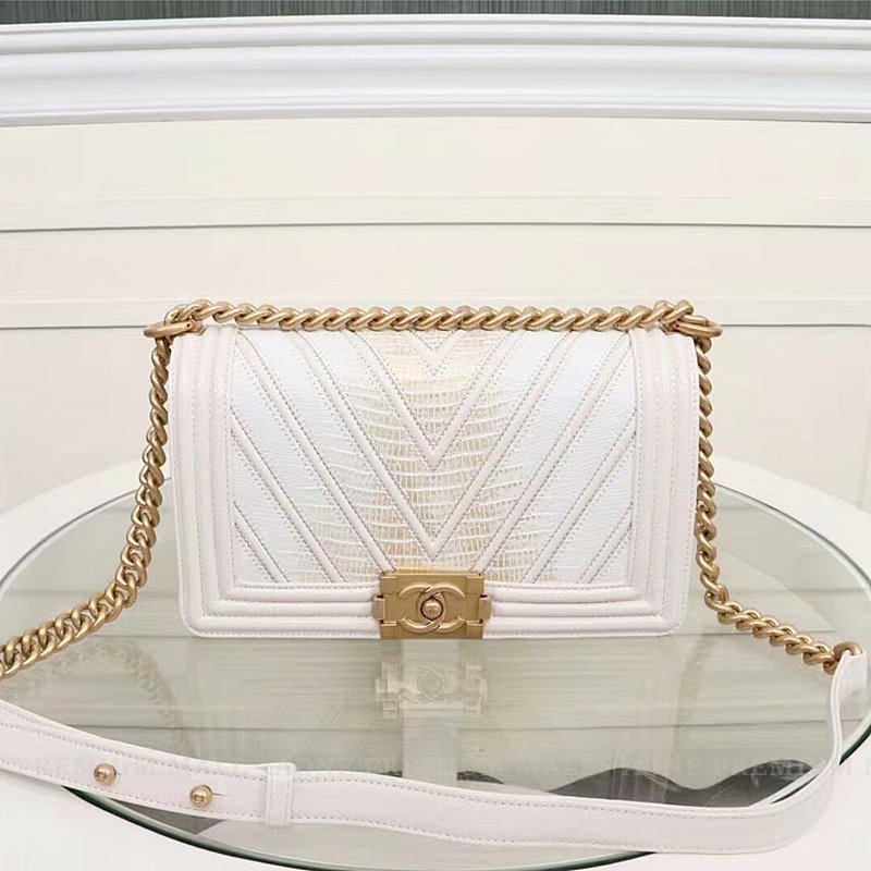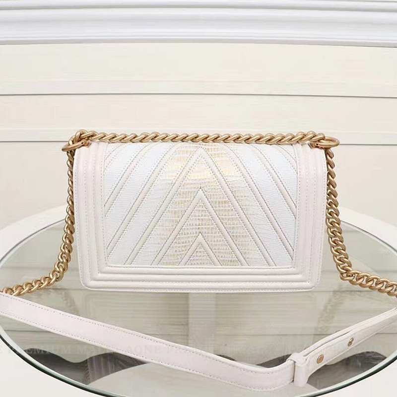Chanel Large Stitch Chevron Liazrd Pattern Calfskin Medium Boy Flap Bag White 2016