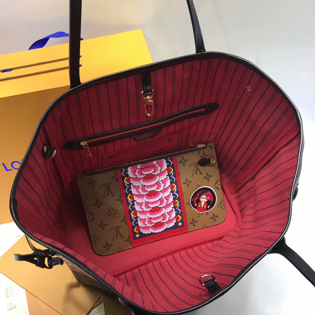 니콜라 제스키에르가 2018 크루스 패션쇼를 위해 디자인한 큼직하고 과감한 가부키 스티커 디테일이 더해져 하이 패션 아이템으로 다시 태어난 네버풀입니다 일본 문화에서 영감을 받은 가부키 모티프를 모노그램 캔버스 위에 정교하게 프린트한 디자인으로 소장가치가 높은 에디션입니다