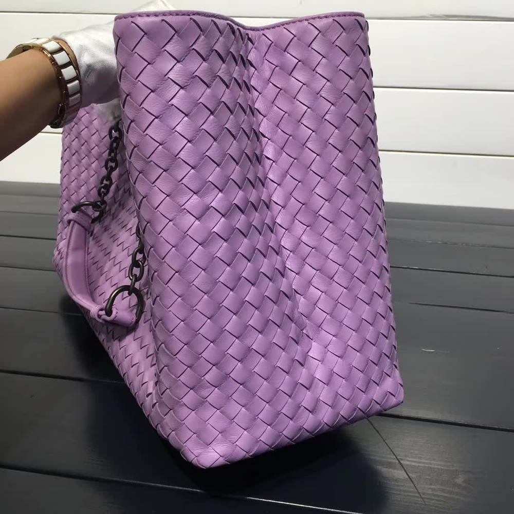 나파 가죽 소재의 직사각형 토트 백 예술적인 장인 정신이 돋보이는 인트레치아토 모티브의 심리스 디자인 모델입니 넉넉한 사이즈로 뛰어난 실용성을 겸비한 이 제품은 길이 조절 가능한 체인과 가죽 핸들을 이용해 숄더 백으로도 연출할 수 있습니 부드러운 스웨이드 안감으로 처리된 내부는 넓은 지퍼 파티션 양 옆으로 두 개의 넉넉한 수납공간을 갖추고 있습니 한쪽 수납공간에 열쇠나 휴대폰 작은 소지품 등을 넣을 수 있는 한 개의 지퍼 포켓과 두 개의 용도 플랫 포켓을 갖추고 있습니
