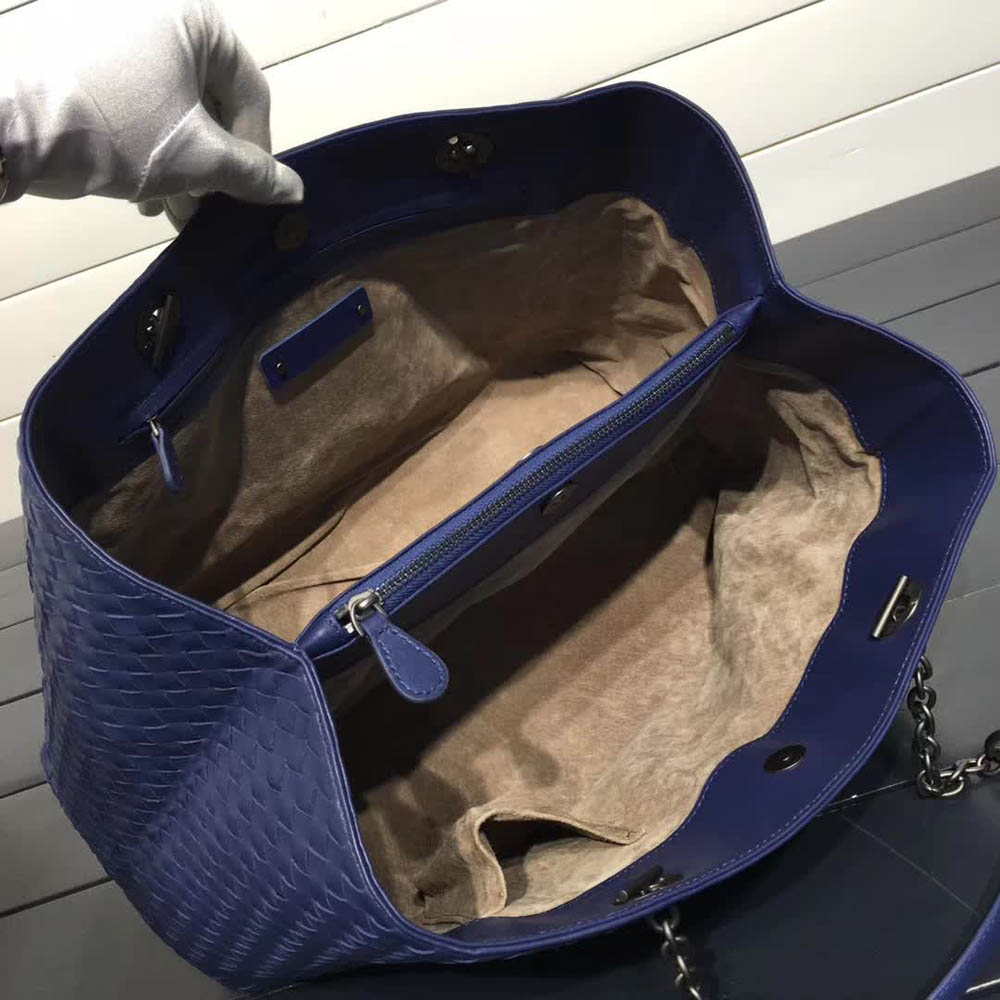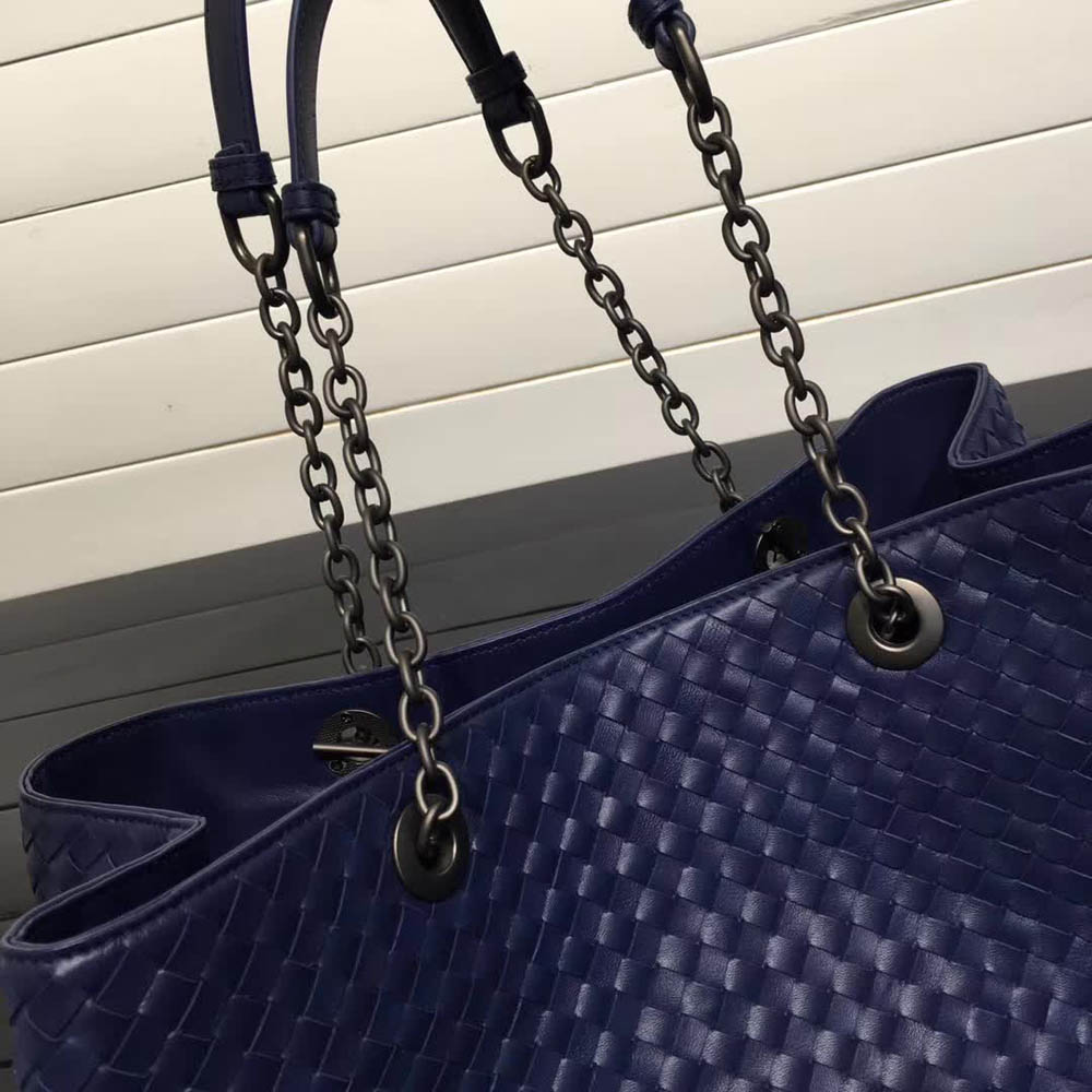 나파 가죽 소재의 직사각형 토트 백 예술적인 장인 정신이 돋보이는 인트레치아토 모티브의 심리스 디자인 모델입니 넉넉한 사이즈로 뛰어난 실용성을 겸비한 이 제품은 길이 조절 가능한 체인과 가죽 핸들을 이용해 숄더 백으로도 연출할 수 있습니 부드러운 스웨이드 안감으로 처리된 내부는 넓은 지퍼 파티션 양 옆으로 두 개의 넉넉한 수납공간을 갖추고 있습니 한쪽 수납공간에 열쇠나 휴대폰 작은 소지품 등을 넣을 수 있는 한 개의 지퍼 포켓과 두 개의 용도 플랫 포켓을 갖추고 있습니 소재: 나파 가죽 컬러: 블랙 메탈 장식: 브루니토 마감 세로: 25cm 가로: 40cm 폭: 16cm