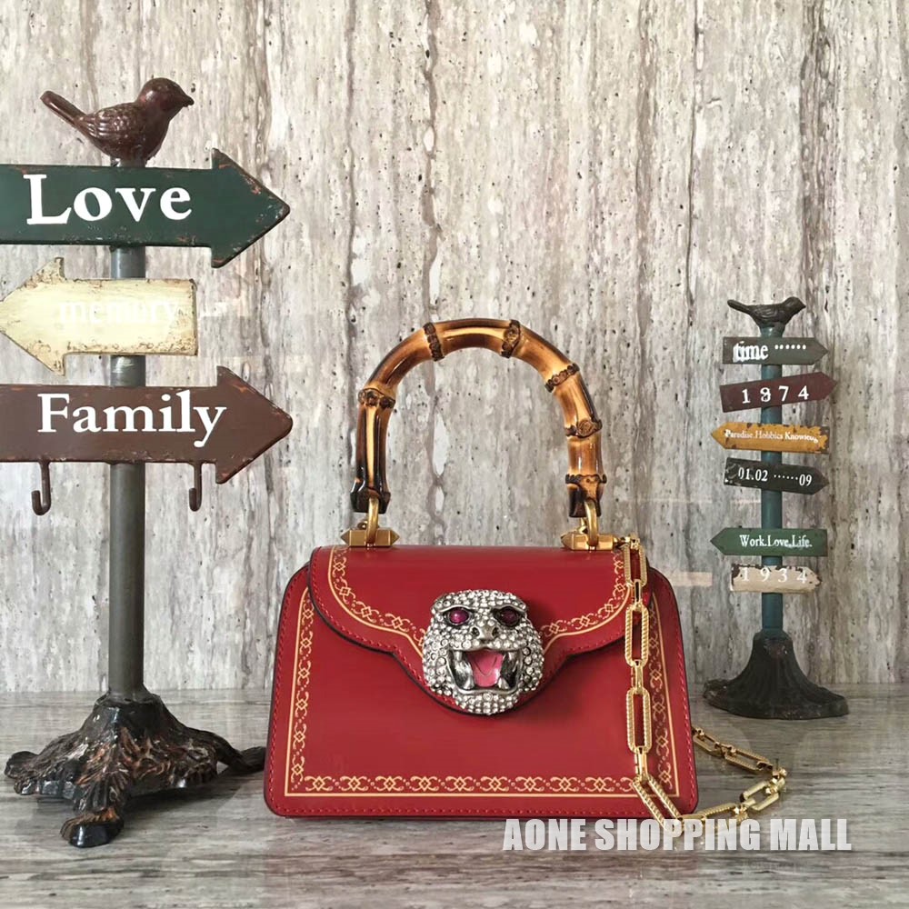 글로시 가죽 미니 사이즈 스트럭처드 탑 핸들 백 정교한 브레이디드 패턴의 골드 프린트 프레임 아이코닉 뱀부 핸들과 빛나는 크리스탈 및 눈 부분에 2개의 스톤이 장식된 컬러 에나멜을 칠한 포효하는 펠린 헤드 심볼 숄더백으로 착용할 수 있는 탈착 가능한 체인 스트랩 컬렉션에서 영감을 받은 독특한 프린트 장식의 표지가 돋보이는 포켓 사이즈의 작은 책 제공 영국 작가 제인 오스틴(Jane Austen)이 검열이나 사회적 압력에서 자유로웠던 10대 시절 집필한 단편집 Juvenilia 구찌 컬렉션과 일맥상통하는 독창적인 카오스 및 끊임없는 모순이 특징인 작품 2017 가을/겨울 패션쇼 컬렉션 화이트 글로시 가죽 골드 프린트 프레임 크리스탈 디테일의 펠린 헤드 푸시 클래스프 잠금장치 스캘럽형 플랩 3개의 오픈 컴파트먼트 2개의 내부 오픈 포켓 스냅 버튼 잠금장치와 책 디테일의 내부 포켓: 제인 오스틴의 초기 작품 뱀부 핸들 95cm 드롭 탈착 가능한 체인 숄더 스트랩 52cm 드롭 가로 19cm x 세로 11cm x 너비 13cm 로즈 프린트 실크 라이닝