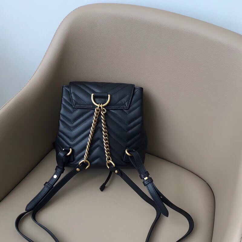 GG 마몽 스몰 사이즈 소프트 스트럭처드 백팩. 특수 처리를 거쳐 빈티지 효과를 연출하는 쉐브론 마틀라세 가죽 소재로 2018 프리폴 컬렉션에서 다양하게 선보인 디자인. 아카이브 디자인에서 영감을 얻은 더블 G 장식으로 더욱 돋보이는 플랩. 내부에 숨겨진 드로우스트링