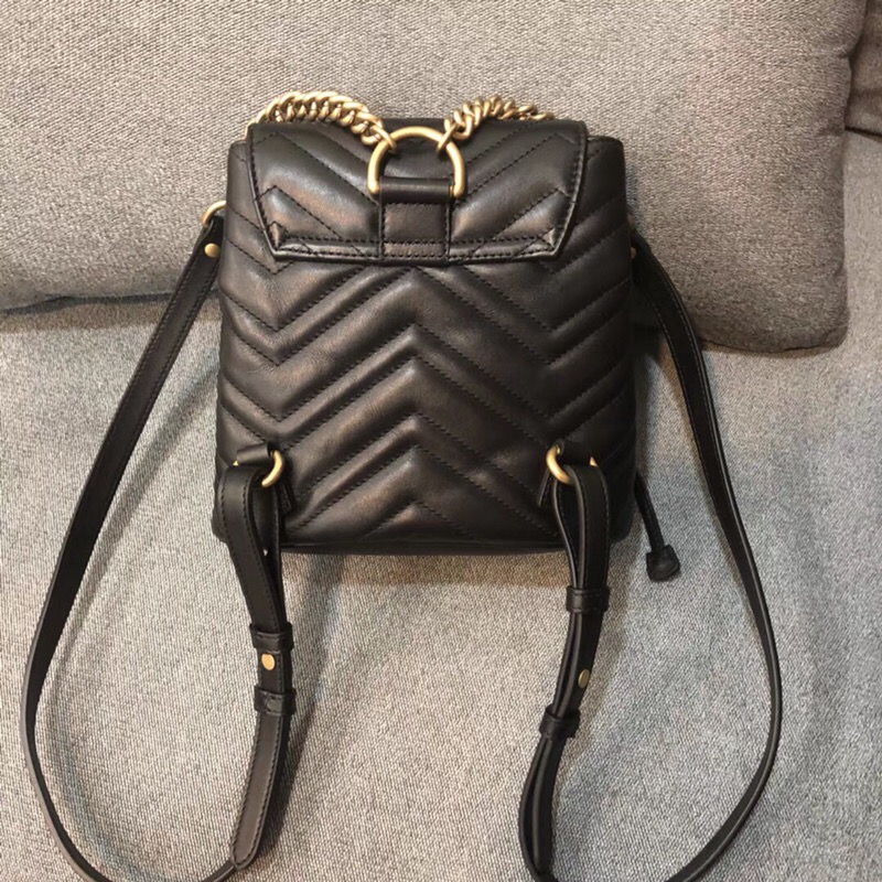 GG 마몽 스몰 사이즈 소프트 스트럭처드 백팩. 특수 처리를 거쳐 빈티지 효과를 연출하는 쉐브론 마틀라세 가죽 소재로 2018 프리폴 컬렉션에서 다양하게 선보인 디자인. 아카이브 디자인에서 영감을 얻은 더블 G 장식으로 더욱 돋보이는 플랩. 내부에 숨겨진 드로우스트링.