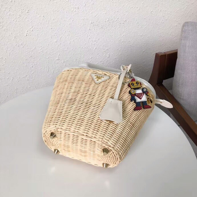 • 프라다 헴프 트라이앵글 로고 스몰 버킷백 1BG172 화이트