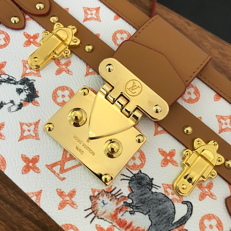 제품 세부 정보--- - 탈착형 가죽 스트랩 - 모노그램 캔버스 - 소가죽 트리밍 - 골드 마감 브라스 -락 - 골드 마감 브라스 - 자석형 여밈 - 양가죽 내피 - 루이 비통 트렁크 모티프 - 모노그램 캔버스 - 종류: 섬유제품 핸드백 - 소재: 캔버스 천연가죽(소) -