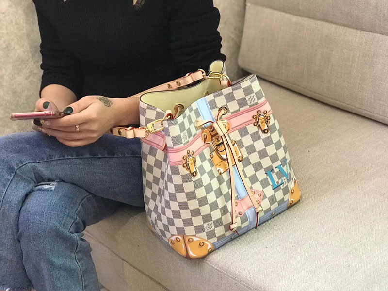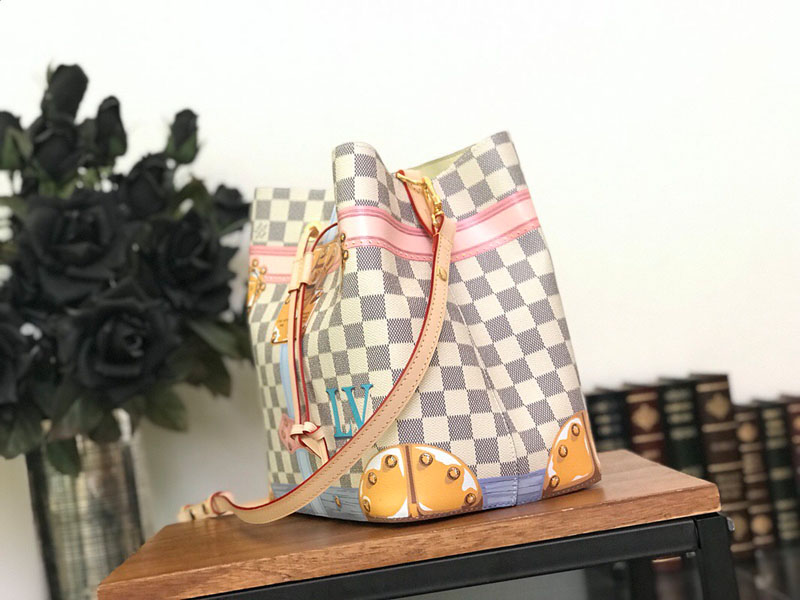 네오노에는 길이 조절형 스트랩을 늘여서 크로스 바디 스타일로 착용할 수 있는 트렌디한 버킷 백입니다 트렁크 모서리와 유서 깊은 잠금장치를 연출한 트롱프 뢰유(trompe loeil) 스크린 프린트가 유연한 다미에 아주르 캔버스와 어우러져 루이 비통의 헤리티지에 재미를 더해줍니다