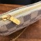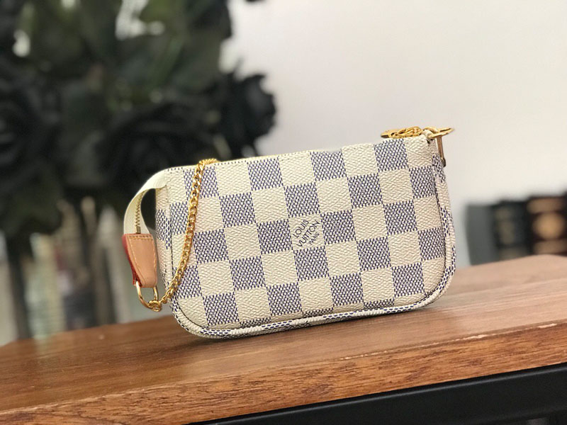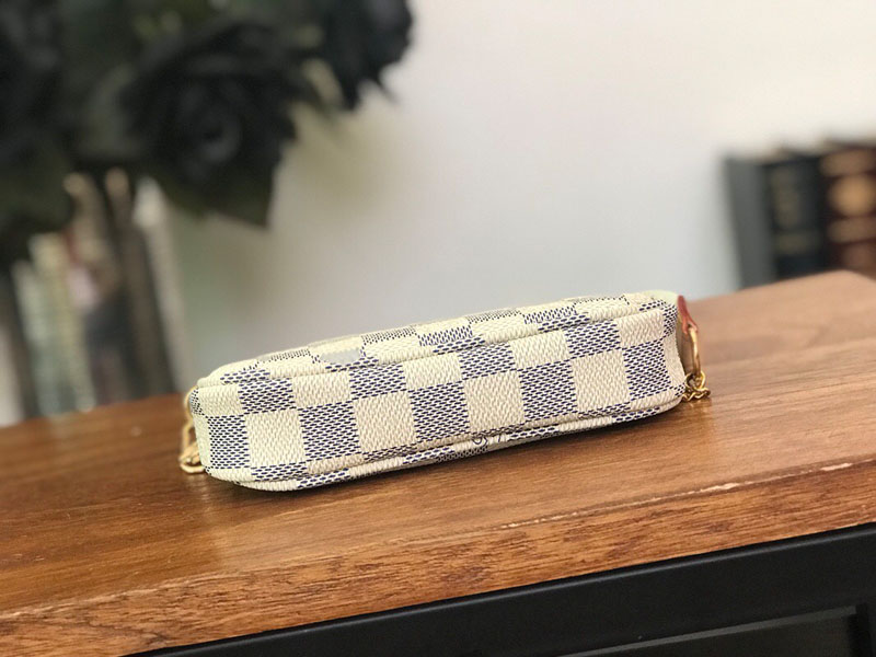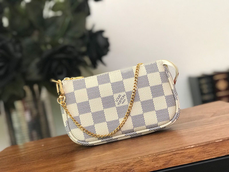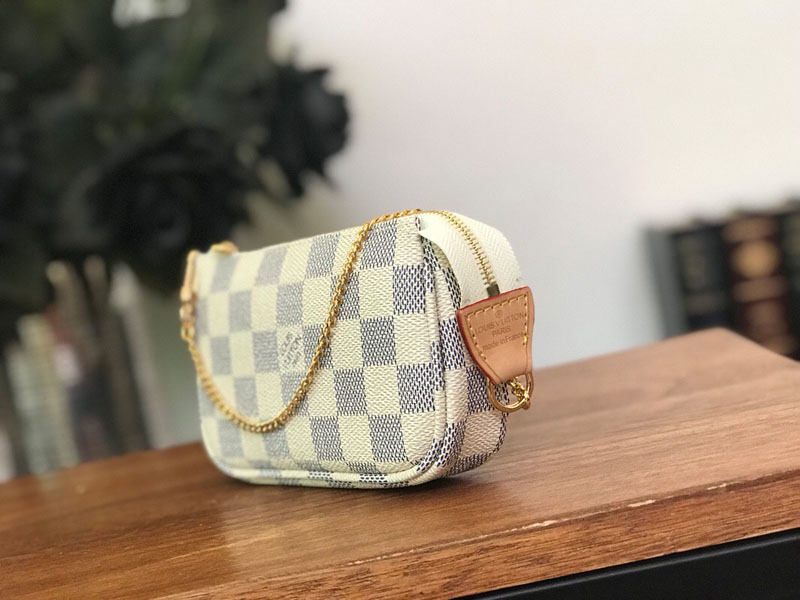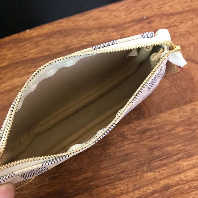 화장품이나 다른 소품들을 수납하기에 적합한 미니 퍼스가 다미에 아주르 캔버스 라인으로 선보입니다 핸드백에 부착하기 위한 골든 브라스 체인을 특징으로 합니다