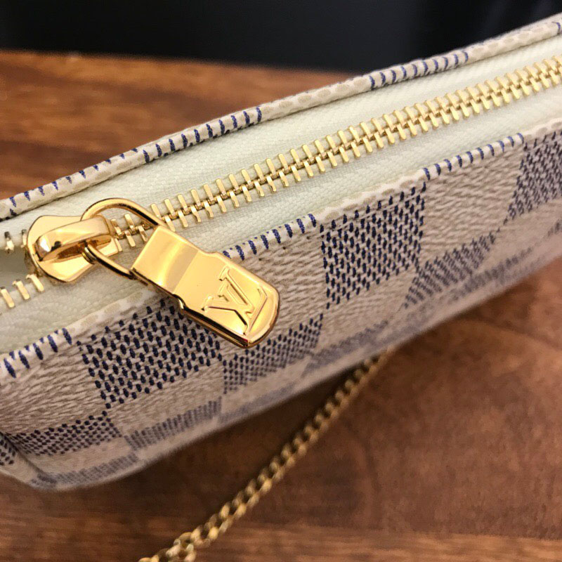 제품 세부 정보--- 15.5?x 10.5?x 4.0 cm (길이?x 높이?x 너비) - 다미에 아주르 캔버스 라인 천연 소가죽 트리밍과 텍스타일 라이닝 - 골든 브라스 장식 - 지퍼 잠금 장치 - 핸드백이나 청바지에 부착 가능한 샤이니 브라스 체인 MINI POCHETTE ACCESSORIES