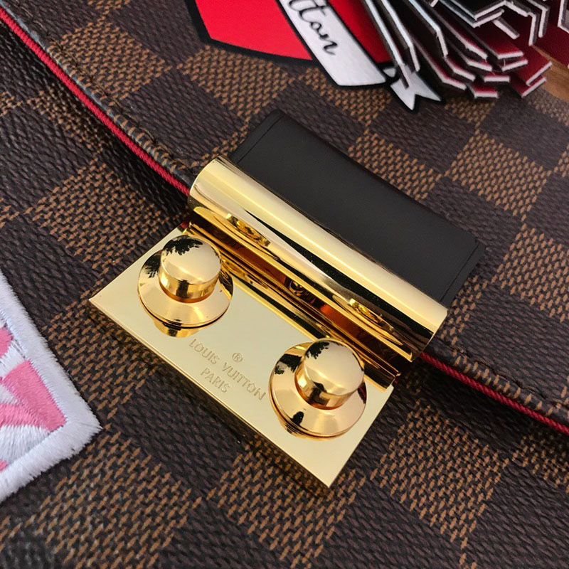 제품 세부 정보--- 25.0?x 17.0?x 9.5 cm (길이?x 높이?x 너비) 다미에 에벤 코팅 캔버스 프린트 및 자수를 더한 직물 시퀸 및 패치초콜릿 소가죽 트리밍레드 면 캔버스 안감골드 마감 금속 디테일플랫 손잡이 탈착 가능한 숄더/크로스 바디 스트랩 플랩 + 잠금장치 여밈 분리 가능한 스무스 소가죽 태슬내부 플랫 포켓겉감:캔버스 천연가죽(소가죽)안감:폴리에스터 CROISETTE
