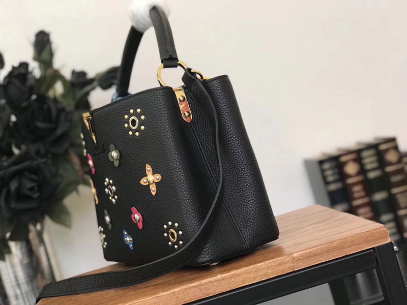 카퓌신 PM 메커니컬 플라워 모델의 느와르 컬러 버전입니다 상징적인 모노그램 플라워를 현대적이고 대담한 감성으로 재해석한 디자인입니다 꽃의 중앙부를 수놓아 록 무드를 더한 금속 스터드는 오래 전부터 루이 비통 트렁크에 모노그램 캔버스를 고정시키기 위해 사용한 네일 장식을 본딴 디테일입니다 다양한 스타일과 하우스의 시그니처가 절묘하게 어우러진 여성미가 돋보이는 테마가 특징입니다