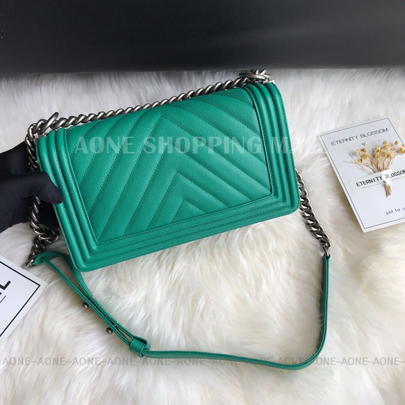 • 샤넬 스몰 캐비어 레더 쉐브론 보이 플랩 숄더 백 라이트 골드 실버