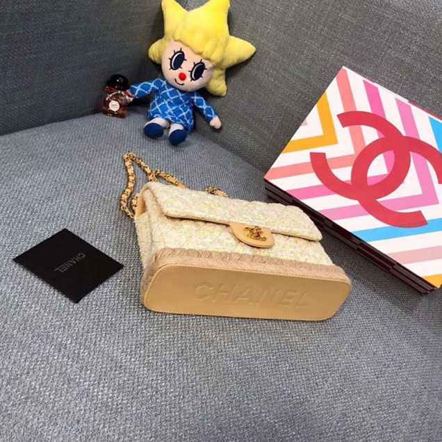 샤넬 Apricot 트위드 우븐 스트로우 클래식 플랩 백 살구 > 가방