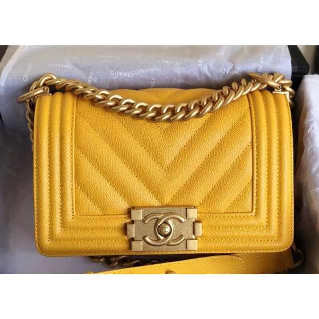 Chanel-caviar-leather-chevron-boy-flap-shoulder-small-bag-yellow-with-gold-hardware-2018