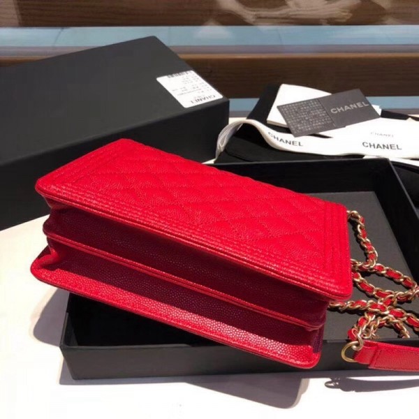 • 샤넬 Grained 카프스킨 보이 Square 월릿 온 체인 WOC 레드 2018