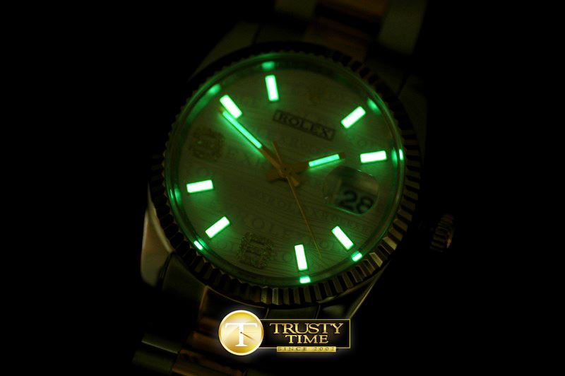 | 다이얼 컬러 | Chagne Gold Insignia Dial Superlume Stick Hour Markers and Needles Genuine Diamonds Crested 6 and 9 Markers |