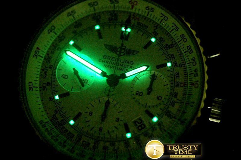 | 특징 | Long Awaited!! True 1 : 1 Navitimer!! (Latter Version with Red Arrow Head Chrono Needle) Made with a Genuine Watch Completely Dissected (Earlier Versions are all Made from Pics and Imagination)!! Original C3 Superlume as per the Genuine Non Recess Date!! Date 1 to 9 is in Correct Different Direction to 10 to 31!! Functional Slide Rule!! Immediate Delivery!! |