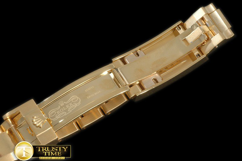 밴드 소재 Brushed 18K Yellow Gold|Wrapped to 10-15 mils|New Style Oyster Bracelet with Insignia 싱글 폴드over Clasp |Serial number inscribed on end links