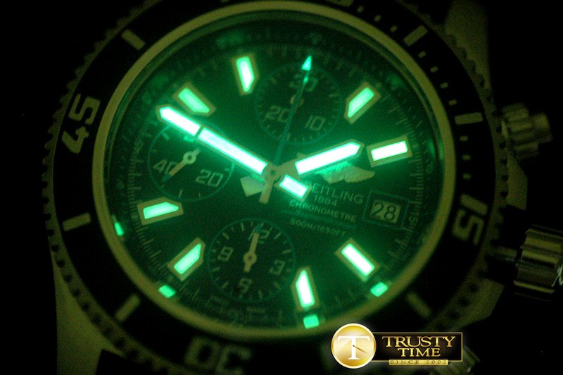 다이얼 컬러 Black Dial and Subdials Polish Steel Numeral Markers (Maker Claims its Superlume) Blue Sec Hand and Indexes