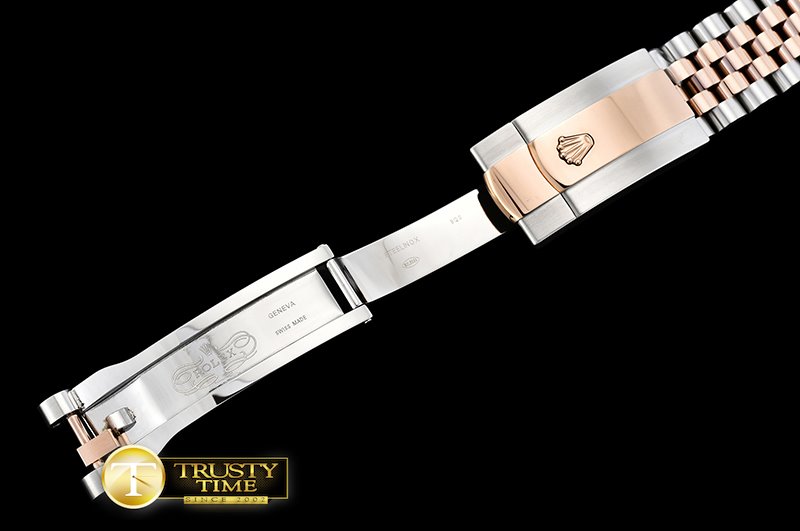 | 밴드 소재 | 18K Two Tone Rose Gold Thick Plated (5 mils) on Solid Stainless Steel 316F Jubilee Bracelet with New Style Rolesor 폴딩형 디버클 |