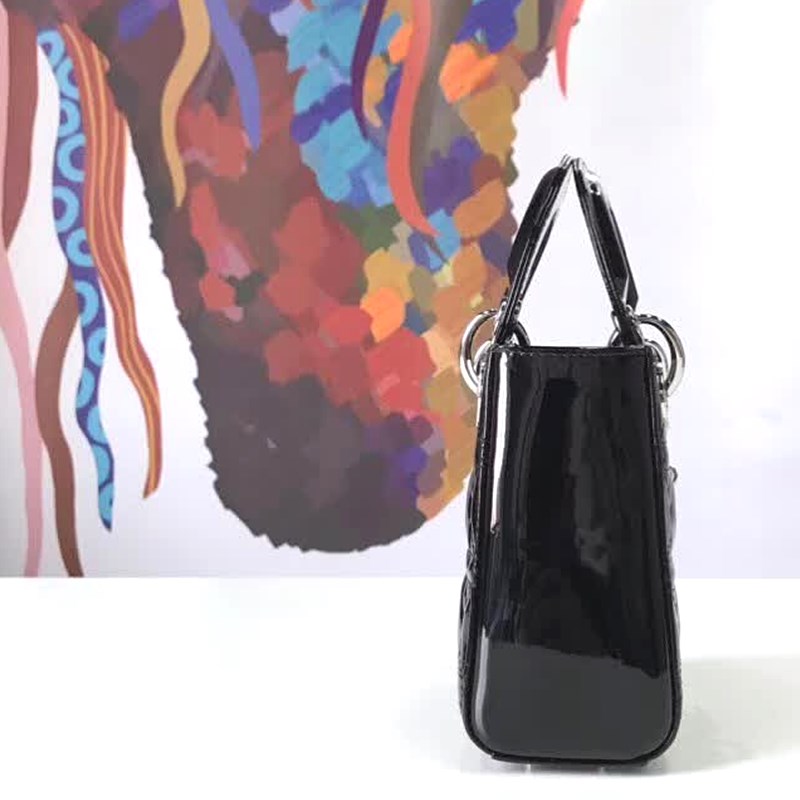 디올 송아지 가죽 LADY DIOR 미니 백 페이턴트 송아지 가죽 체인 장식 “Lady Dior” 미니 백 까나쥬 스티칭 탈착 가능한 롱 체인 페일 골드 컬러 메탈 주얼리 토트백 숄더백 크로스백으로 착용 크기: 17 x 15 x 7cm