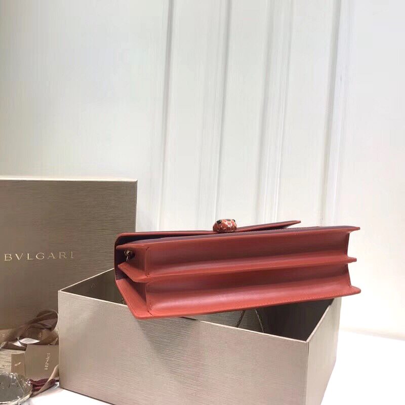 루비 레드 컬러의 카프 레더 소재에 황동 라이트 골드가 도금된 뱀 머리 잠금장치 세르펜티 포에버 플랩 커버 백
